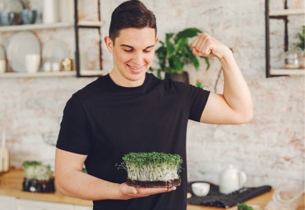 Kiełki słonecznika dostarczają dużo wapnia oraz fosforu, co wpływa korzystnie na stan naszych kości i zębów. Są również bogate w magnez, miedź oraz cynk, a także białko. To też naturalne źródło rzadko obecnej w roślinach witaminy D. Kiełki słonecznika można wyhodować bardzo szybko – do wzrostu potrzebują tylko 2-3 dni.